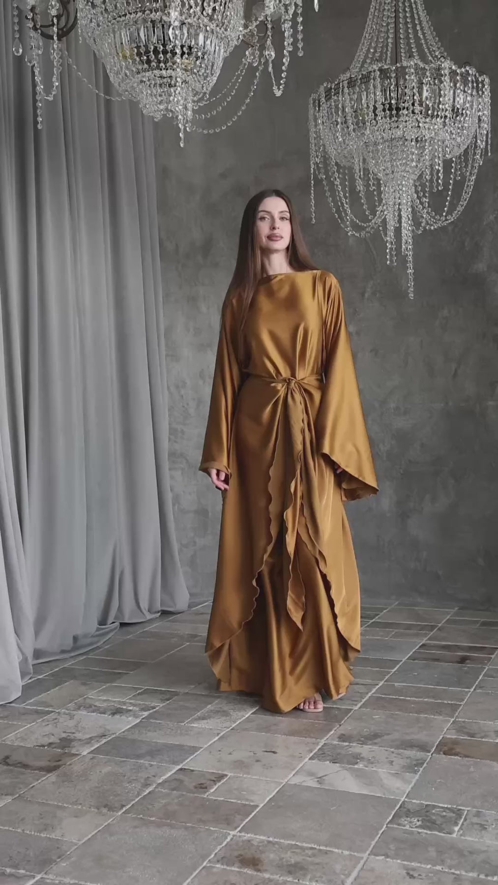 Colour: Golden Bronze Fabric: Rich satin that drapes beautifully Sleeves: Statement bell sleeves Design: Adjustable waist tie for a flattering fit