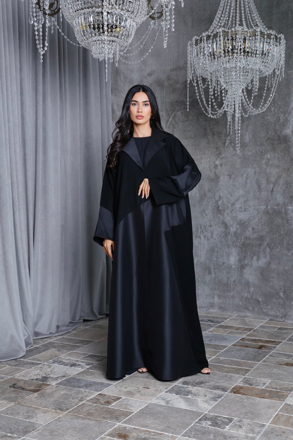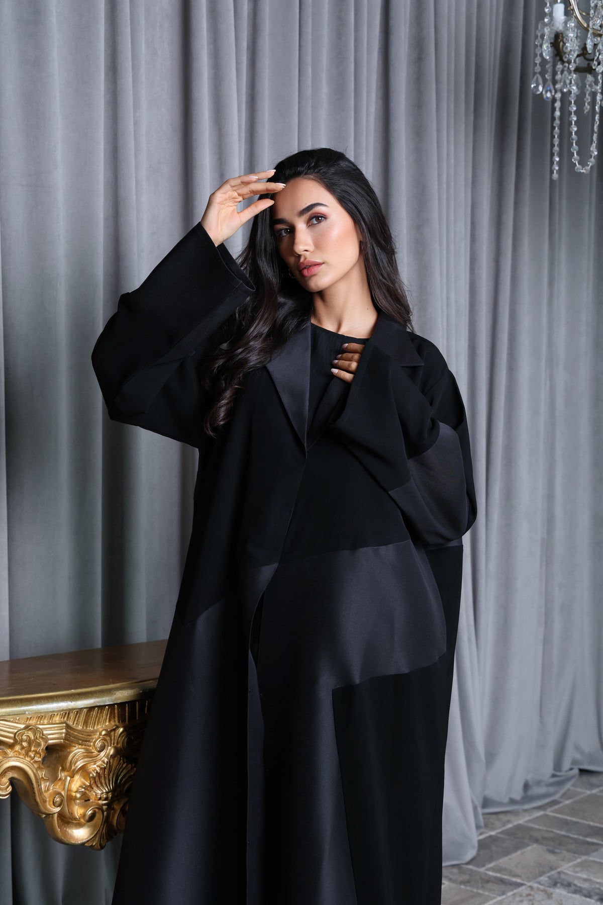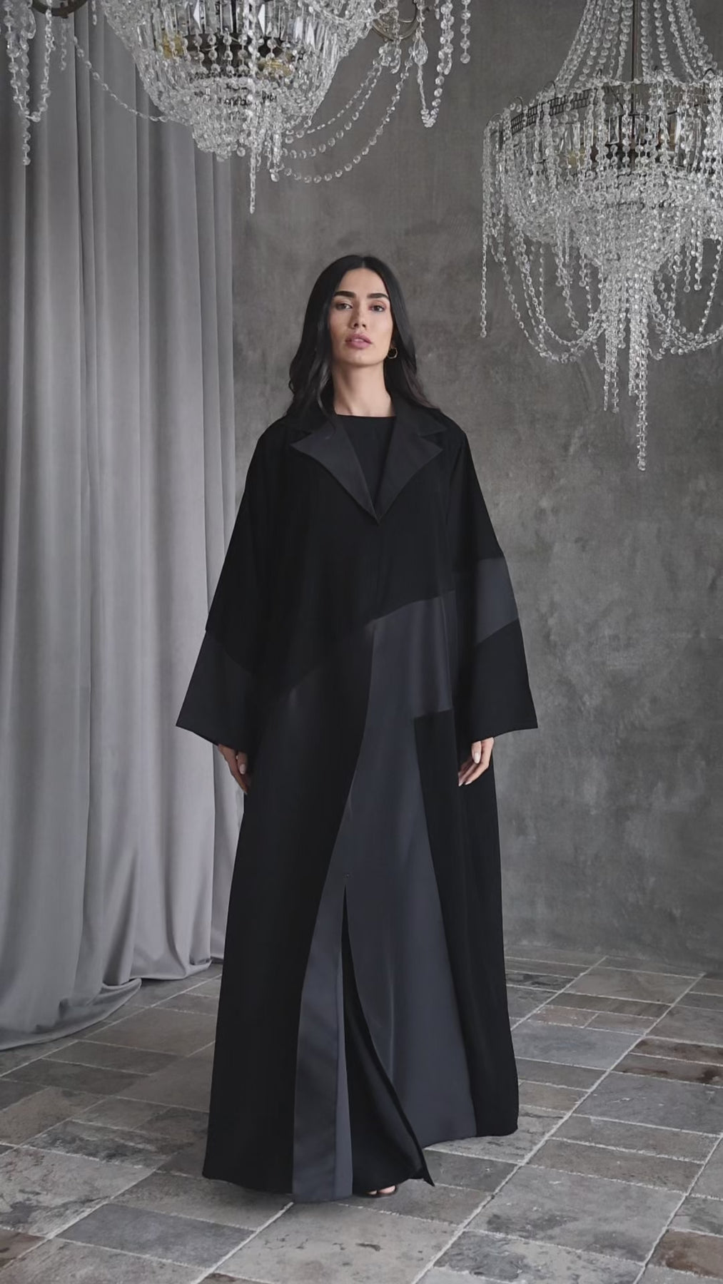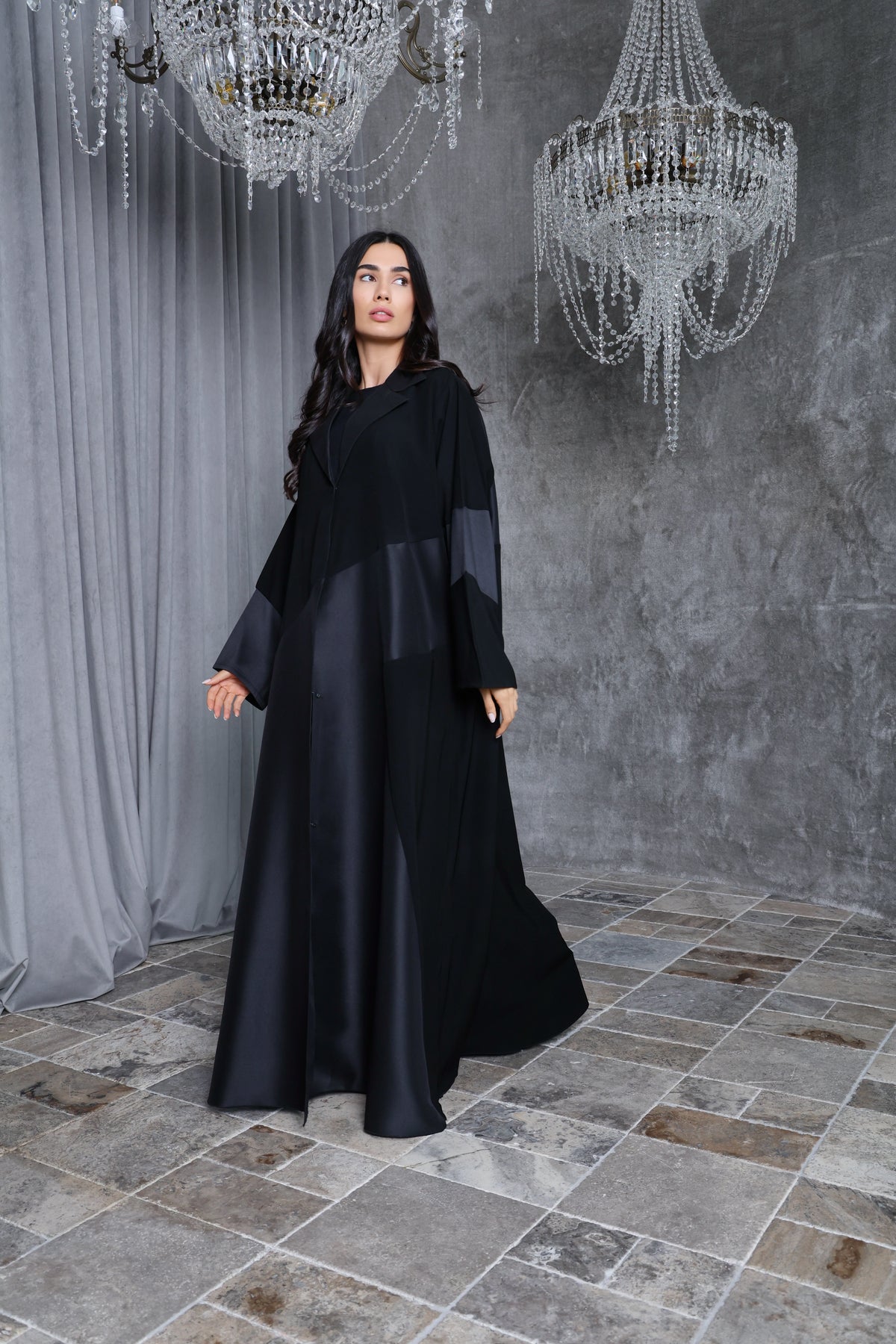 The Eva abaya is defined by its modern contrast panelling, blending matte and satin finishes for a sleek, elevated look. Tailored with a structured collar and clean lines, it delivers understated sophistication with a contemporary edge ā perfect for special occasions.